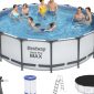 Bazeni Bestway Steel Frame Pro su nadzemni bazeni sa metalnom konstrukcijom. Metalni nosači su izrađeni od čelika i zaštićeni su posebnom prevlakom koja sprečava njihovo rđanje. Telo bazena je izrađeno od veoma čvrstih i otpornih materijala koji su namenjeni za višegodišnju upotrebu. Kada sezona prođe, bazen možete isprazniti i odložiti na adekvatno mesto, zaštićeno od mraza. Sastavni deo kompleta čini i filterska pumpa. Namena pumpe je da prečišćava vodu u bazenu i odstranjuje mehaničke nečistoće. Pomoću odgovarajućih creva pumpa se prikači na bazen i konstantno filtrira vodu. Uključuje se u struju pomoću strujnog kabla.